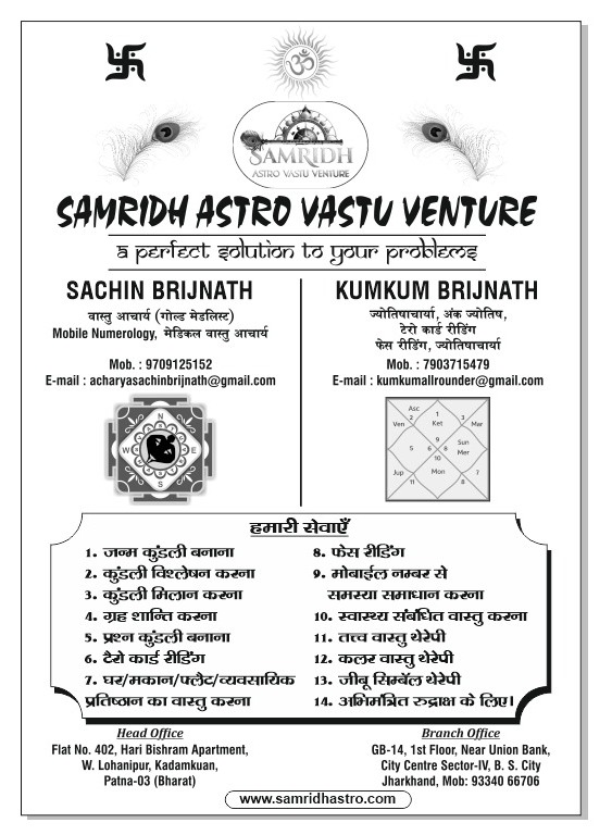 Astrology and vastu solutions for balance, clarity, and lasting prosperity represent our commitment to helping individuals and families create harmony in both life and living spaces. At Samridh Astro Vastu Venture, we combine the ancient wisdom of astrology, vastu shastra, and numerology to identify the root causes of challenges and provide practical, effective remedies. Our astrological services include birth horoscope analysis, kundli matching, and query-based guidance to support decisions related to career, business, marriage, finance, health, and personal growth. Through vastu solutions, we help align homes, offices, and commercial spaces with natural energies using elemental vastu, colour therapy, symbolic corrections, and spiritual tools. Our approach is non-invasive, customized, and focused on long-term benefits rather than temporary fixes. We believe true prosperity comes from balance between mind, environment, and destiny, and clarity comes from understanding one’s path. With years of experience and ethical practices, we guide clients toward informed decisions, improved relationships, mental peace, and sustainable success. Every consultation is handled with care, confidentiality, and sincerity. Our aim is to empower people to live confidently, attract positivity, and build a stable, prosperous future through trusted astrological and vastu guidance.